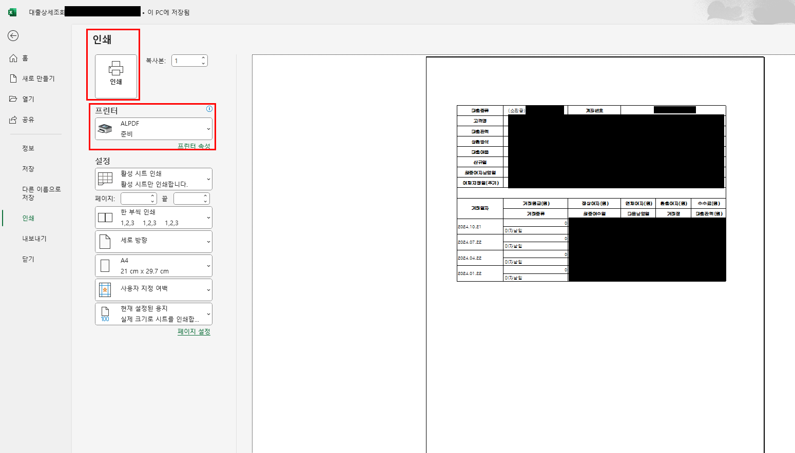 6) 엑셀로 저장하거나 이자내역서 출력