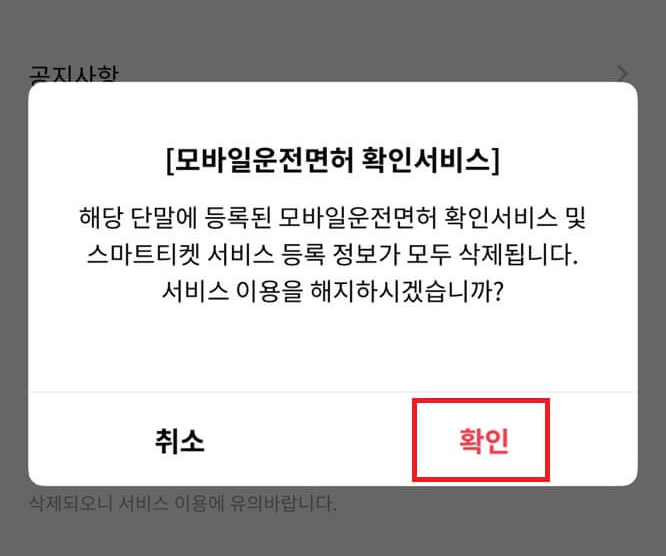 '모바일운전면허 확인서비스 해지'를 눌러서 삭제해 줍니다.